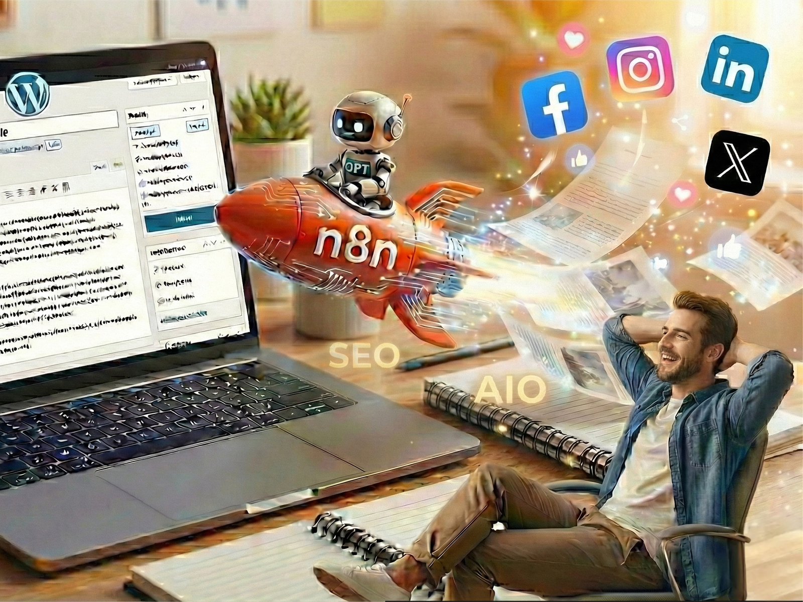 Audit technique, recherche de mots-clés, rédaction assistée par IA (GPT-4, Claude, Gemini), optimisation sémantique, publication automatique sur WordPress et diffusion multicanal sur les réseaux sociaux. Le tout orchestré par n8n, un outil d’automatisation open source qui connecte chaque brique du pipeline sans intervention manuelle. Résultat attendu : +300 % de trafic organique en 6 mois et une présence dans les réponses de ChatGPT, Perplexity et des autres assistants IA.